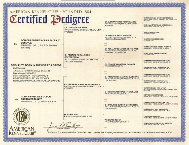 Dam is GCh Brisline's Goforit Energizer Bunny and sire is GCh Penaire's Chip Leader at Longvue. Click to see pedigree